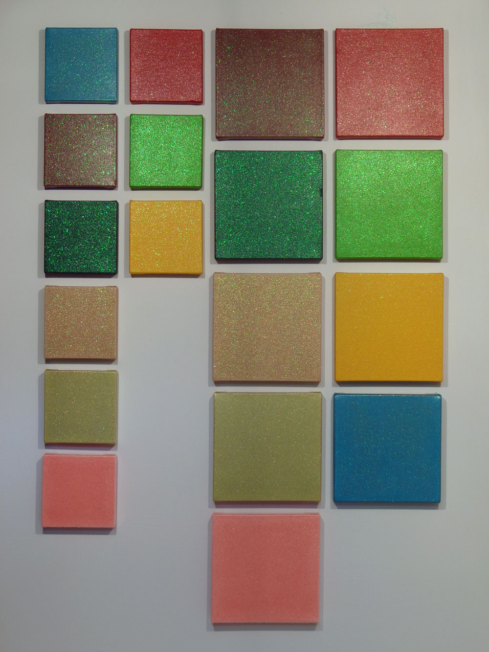 S, XS (series of 18), detail 2022–23 PVA, resin assisted PVA, pigment, glitter on canvas S (1–9): 30 x 30 x 4 cm XS (1–9): 20 x 20 x 4 cm